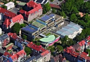 modernes Schulgebäude und eine gestapelte 6-fach-Sporthalle ersetzt. Der denkmalgeschützte Altbau wird