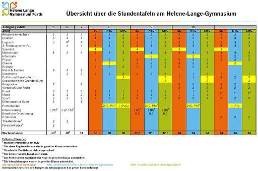 Folgende Stundentafeln geben eine detaillierte Auskunft über die Wochenstunden je Fach und Jahrgangsstufe: